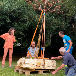 Cette sculpture est réalisée en métal, faite à la main, posée sur une pierre du Causse de Savignac et offerte par la carrière.